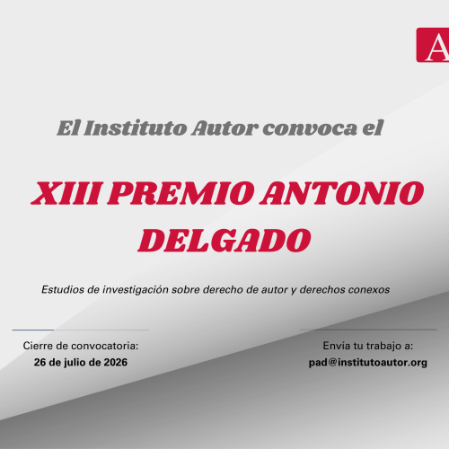 El Instituto de Derecho de Autor (Instituto Autor) convoca la XIII edición del Premio Antonio Delgado (PAD), que busca premiar a las y los autores de los mejores estudios de investigación en torno al derecho de autor y los derechos conexos. El/La ganador/a del PAD recibirá una dotación económica de 6.000 euros (más 300 euros en concepto de anticipo de derechos de autor) y la publicación de su estudio en formato físico y digital.
